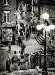 Rights-Managed photo of People walking at night on historic streets Rue du Petit Champlain and Rue Sous Le Fort of old Quebec City, view from above. Quebec, Canada. Black and white photo. Ville de Québec. Photo by Alex Maxim. This image is available for licensing for a variety of editorial and commercial uses in publications, designs, print and online.