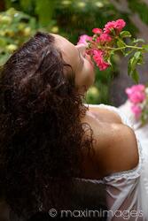 Rights-Managed photo of Romantic sensual rear view portrait of a young woman with wet dark hair smelling pink roses in a garden under pouring rain Photo by Alex Maxim. This image is available for licensing for a variety of editorial and commercial uses in publications, designs, print and online.