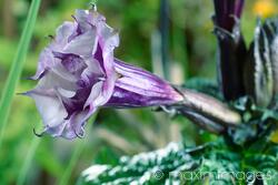 Royalty-Free photo of Datura metel fastuosa, Purple Ballerina, flower blossom. Alson know as Devil's trumpet or Angel's trumpet. Side view. Photo by Alex Maxim. This image is available for licensing for a variety of editorial and commercial uses in publications, designs, print and online.