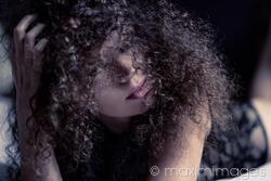 Rights-Managed photo of Artistic sensual portrait of a young woman lying on a bed looking at camera with her face partially covered with long curly hair Photo by Alex Maxim. This image is available for licensing for a variety of editorial and commercial uses in publications, designs, print and online.