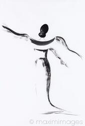 Sumie, Japanese ink painting of a Geisha dancing in a kimono with her hands spread like wings. The artwork is executed in minimalistic abstract strokes of black ink on white rice paper background. You can buy a license or prints of this high-resolution, high-quality photo suitable for large-size publications, large-format prints and posters.