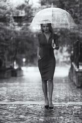 Young woman in an elegant dress with an umbrella walking thoughtfully on a rainy day on a cobbled city street Black and white portrait MaximImages.com