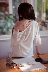 Descriptive keywords: woman, artist, painting, back, body, art, painted, shoulder, bare, bared, sakura, blossom, blossoms, branch, flowers, drawing, artists, women, female, sensual, sexy, home, rear, studio, sensuality, relaxed, natural, asian, japanese, oriental, rear view, sitting, window, abstract, tattoo, tattoos, behind, painter, fine art, fine arts, spiritual, zen, sumi, sumi-e, brushes, sexuality, indoor, indoors, inside, light, soft, young, adult, caucasian, long hair, brunette, one, single, alone, artistic