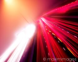 Royalty-Free photo of Artistic dynamic image of colorful light trails of busy highway traffic on a foggy night, Highway 401, Toronto, Ontario, Canada. Photo by Alex Maxim. This image is available for licensing for a variety of editorial and commercial uses in publications, designs, print and online.