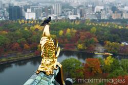 Descriptive keywords: osaka, castle, park, canal, raven, crow, bird, roof, rooftop, japan, parks, gold, golden, guilded, ravens, crows, detail, fish, decor, decoration, element, architecture, architectural, elements, fall, autumn, views, aerial, chuo, chuo-ku, city, view, scenery, sceneries, fog, foggy, misty, artistic, morning, trees, foliage, outdoor, outdoors, outside, birds, cities, japanese, asia, asian, travel, destination