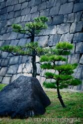 Royalty-Free photo of Japanese black pine trees, Pinus thunbergii, and a rock in front of stone castle wall in Osaka, Japan Photo by Alex Maxim. This image is available for licensing for a variety of editorial and commercial uses in publications, designs, print and online.