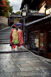 Rights-Managed photo of Couple with Japanese parasols wearing traditional kimono walking down an old street, Yasaka dori, near Kiyomizu-dera in Higashiyama, Kyoto, Japan 2017. 舞妓 芸者 芸妓 京都 日本 旅行写真 きもの 着物 人 Photo by Alex Maxim. This image is available for licensing for a variety of editorial and commercial uses in publications, designs, print and online.