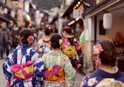 Group of girls in bright Yukata kimonos with their obi tied in a bow walking on Matsubara dori street in Kyoto near Kiyomizu-dera. You can buy a license or prints of this high-resolution, high-quality photo suitable for large-size publications, large-format prints and posters.