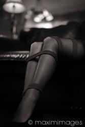 Royalty-Free photo of Sensual black and white closeup of legs of a sexy woman sitting on a sofa in a living room wearing black high heels and stocking, with decorative shibari bondage ropes around her ankles, calves and thighs. Photo by Alex Maxim. This image is available for licensing for a variety of editorial and commercial uses in publications, designs, print and online.