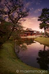 Rights-Managed photo of Jodo-shiki garden, Jodoshiki teien, Pure Land garden with a pond in front of the Phoenix Hall, Amida hall of Byodo-in Buddhist temple. Beautiful sunset scenery. Uji, Kyoto Prefecture, Japan 2017 Photo by Alex Maxim. This image is available for licensing for a variety of editorial and commercial uses in publications, designs, print and online.