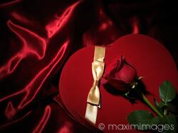 Red heart-shaped gift box and a red rose You can buy a license or prints of this high-resolution, high-quality photo suitable for large-size publications, large-format prints and posters.