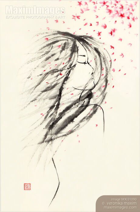 Rights-Managed illustration of Beautiful young asian woman immersed in the wind blowing the sakura flowers and petals in her face and hair. Sensual Japanese Zen Sumi-e ink painting on white rice paper background. Illustration by Veronika Maxim. This image is available for licensing for a variety of editorial and commercial uses in publications, designs, print and online.