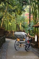 Rights-Managed photo of Japanese rickshaw on an old street in Arashiyama bamboo grove, Kyoto, Japan 2017. Photo by Alex Maxim. This image is available for licensing for a variety of editorial and commercial uses in publications, designs, print and online.
