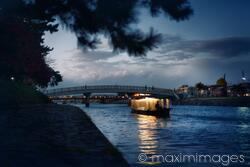 Rights-Managed photo of Sightseeing pleasure cruise boat illuminated with lights on Uji River in twilight. Uji, Kyoto Prefecture, Japan 2017 Photo by Alex Maxim. This image is available for licensing for a variety of editorial and commercial uses in publications, designs, print and online.