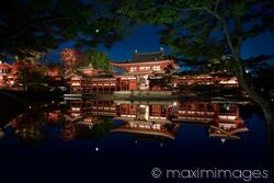 Rights-Managed photo of Byodo-in historic temple Phoenix Hall, Hoo-do, reflecting in the pond illuminated with lights at night over blue twilight sky in autumn, Byodoin, Uji, Kyoto Prefecture, Japan 2017 Photo by Alex Maxim. This image is available for licensing for a variety of editorial and commercial uses in publications, designs, print and online.