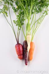 Royalty-Free photo of Organic home-grown heirloom carrots in different colors, purple, red, orange and white, artistic still life isolated on white background Photo by Alex Maxim. This image is available for licensing for a variety of editorial and commercial uses in publications, designs, print and online.