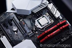 Descriptive keywords: motherboard, cpu, computer, pc, processor, memory, ddr4, i7, ssd, drive, m2, core, main, board, boards, motherboards, electronics, hardware, technology, elements, v-nand, m.2, samsung, 970, evo, 970evo, nvme, vnand, components, chip, slots, ddr-4, chips, dual-channel, sockets, processors, pcb, z370, cpus, installed, 1151, coffee lake, 8700k, i7-8700k, 6-core, black, closeup, close up, color, colour, computers, background, black background, artistic, close-up, detail, details, nobody, studio shot, asus, intel, high angle view