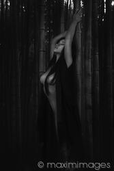 Rights-Managed photo of Beautiful half nude asian woman leaning against a bamboo in a dark forest in black undone kimono revealing her naked breasts. Black and white fine art nude photo. Photo by Alex Maxim. This image is available for licensing for a variety of editorial and commercial uses in publications, designs, print and online.