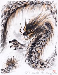 Sumi-e ink painting of a fire dragon Mon-Tey, ancient spirit of power and knowledge. Black and golden ink on white background. MaximImages.com