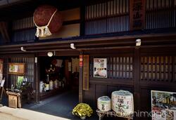 Rights-Managed photo of Harada Sake Brewery 原田酒造場 entrance at Kamisannomachi old town of Takayama city with Sugidama, brown cedar ball, hanging above The cedar orb hanging outside a brewery means that the sake is made and ready to be sold to public. Japan travel photography, Takayama, Gifu prefecture, 2018. 杉玉 酒林 酒蔵 作り酒屋 高山 日本 旅行写真 上三之町の町並 Photo by Alex Maxim. This image is available for licensing for a variety of editorial and commercial uses in publications, designs, print and online.