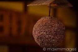 Royalty-Free photo of Closeup of Sugidama or Sakabayashi, cedar ball, hanging above the entrance of a sake brewery in Hida-Takayama, Gifu, Japan. 杉玉 酒林 酒蔵 Photo by Alex Maxim. This image is available for licensing for a variety of editorial and commercial uses in publications, designs, print and online.