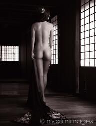 Rights-Managed photo of Black and white fine art nude photography of a Beautiful asian woman walking naked in dark rooms of a traditional Japanese house, dragging her kimono behind, her nude back lit by the soft light coming from shoji screens of sliding doors. Sepia toned Photo by Alex Maxim. This image is available for licensing for a variety of editorial and commercial uses in publications, designs, print and online.