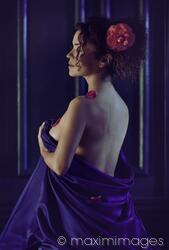 Rights-Managed photo of Romantic boudoir portrait of a beautiful woman with pink camellia flower in her hair sitting in a bedroom with her naked body wrapped in a purple bed sheet revealing her bare back Photo by Alex Maxim. This image is available for licensing for a variety of editorial and commercial uses in publications, designs, print and online.