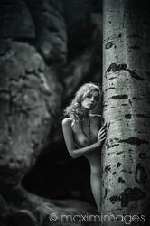 Fine art black and white portrait of a naked young blond woman peeking from behind a birch tree in the rocky forest MaximImages.com