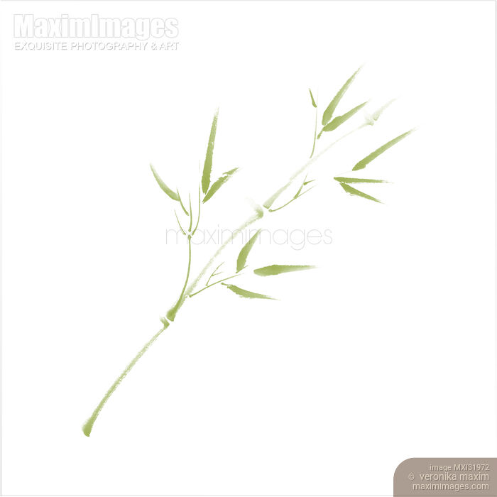 Illustration of Single branch of light green young bamboo with leaves on white background oriental design