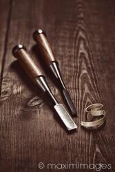 Rights-Managed photo of Artistic closeup of two Japanese bevel-edge Tataki chisels and curly wood shavings on a wooden table. Carpentry and wood working still life. Photo by Alex Maxim. This image is available for licensing for a variety of editorial and commercial uses in publications, designs, print and online.