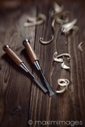 Rights-Managed photo of Artistic still life of two chisels and curly wood shavings on a wooden workbench. Woodwork and carpentry concept. View from above. Photo by Alex Maxim. This image is available for licensing for a variety of editorial and commercial uses in publications, designs, print and online.