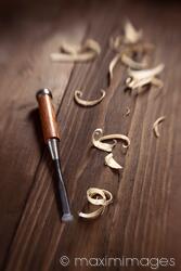 Rights-Managed photo of Artistic still life of a wood-working chisel and curly wood shavings on a wooden workbench background. Carpentry concept. Photo by Alex Maxim. This image is available for licensing for a variety of editorial and commercial uses in publications, designs, print and online.