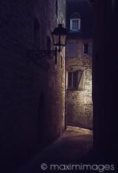 Rights-Managed photo of Small dark empty old street with stone houses in a medieval French town, nighttime scenery. France, Sarlat. Photo by Alex Maxim. This image is available for licensing for a variety of editorial and commercial uses in publications, designs, print and online.