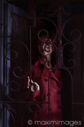 Rights-Managed photo of Woman in red coat standing behind locked window grates, with her hand touching the metal bars in a dark room at night, artistic conceptual portrait. Photo by Alex Maxim. This image is available for licensing for a variety of editorial and commercial uses in publications, designs, print and online.