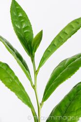 Royalty-Free photo of Green Tea leaves, Camellia sinensis, closeup of plant. Leaves of a tea plant on white studio background. Photo by Alex Maxim. This image is available for licensing for a variety of editorial and commercial uses in publications, designs, print and online.