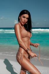 Glamour portrait of a sexy sun-tanned exotic woman in a bikini swimsuit, with seductive expression, posing on a sandy shore of Caribbean Sea beach in Cancun, Mexico. You can buy a license or prints of this high-resolution, high-quality photo suitable for large-size publications, large-format prints and posters.
