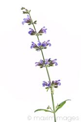 Royalty-Free photo of Artistic closeup of Sage, flowering plant with purple blossoms, Salvia officinalis, medicinal herb, side view isolated on white studio background. Photo by Alex Maxim. This image is available for licensing for a variety of editorial and commercial uses in publications, designs, print and online.