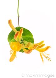 Royalty-Free photo of Yellow-orange Trumpet honeysuckle flowers, Lonicera tellmanniana or L. sempervirens, flowering shrub blossoms on a round green leaf, artistic closeup isolated on white studio background Photo by Alex Maxim. This image is available for licensing for a variety of editorial and commercial uses in publications, designs, print and online.