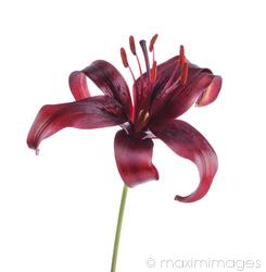 Royalty-Free photo of Dark burgundy Asiatic Lily beautiful flower, Midnight Mystery, isolated on white studio background. Dark red, maroon color. Photo by Alex Maxim. This image is available for licensing for a variety of editorial and commercial uses in publications, designs, print and online.