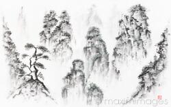 Descriptive keywords: mountains, misty, landscape, landscapes, nature, floating, peaks, panorama, panoramic, mountain, tops, pine, pines, trees, forest, scenic, scenery, distant, pagoda, temple, temples, zen, meditation, buddhist, sumi-e, sumi, china, oriental, orient, asia, still, stillness, painting, art, buddhism, spiritual, spirituality, shen, spirit, serene, serenity, calm, artwork, fine art, ancient, chinese, japanese, peaceful, asian, eastern, ink, wisdom, drawing, paintings, arts, white background, sumi e, sumie, black, green, fog, foggy, mist, tranquil, horizontal, view, simple, simplistic, rice paper, illustration, illustrations, print, abstract, artistic, zhangjiajie, national, park, hunan, tranquility, sumie-seal