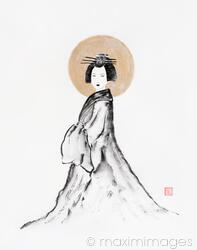 Rights-Managed illustration of Symbolic fine art painting of an elegant Japanese woman with a noble look, wearing a winter coat and a traditional hairstyle standing with the golden sun behind her. Oriental sumi-e black and gold ink painting on white rice paper background. Illustration by Veronika Maxim. This image is available for licensing for a variety of editorial and commercial uses in publications, designs, print and online.