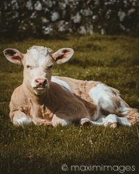 Young calf resting in the grass of a farm field in Ireland. Free range cattle. MaximImages.com