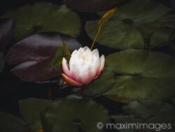 Descriptive keywords: lotus, white, lily, water, flower, flowers, waterlily, lilies, waterlilies, leaves, floating, pond, lake, dramatic, moody, dark, dim, pink, petals, growing, plant, plants, floral, nymphaea, alba, european, background, nobody, mood, spiritual, atmospheric, closeup, close up, close-up, only, one, single