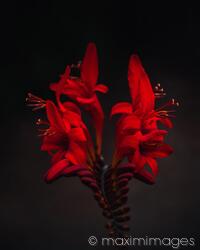 Beautiful red exotic flowers isolated on dark gray black background. Dramatic floral still life in moody shadowy settings. MaximImages.com