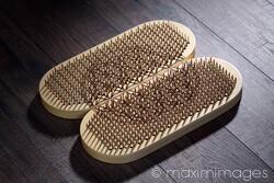 Royalty-Free photo of Closeup of a Sadhu Board, a Yogic board of sharp metal nails, also known as the board of the enlightened, Fire Board, Bed of Nails. Sadhu board is an ancient yogic tool used by the traveling ascetics in India and is made of specific metal nails. The practice consists of standing on the board with bare feet for several minutes to achieve numerous physical, energetic and spiritual benefits. Photo by Alex Maxim. This image is available for licensing for a variety of editorial and commercial uses in publications, designs, print and online.