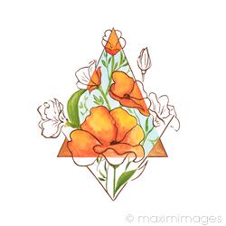 Descriptive keywords: abstract, floral, geometry, sacred, flower, flowers, lilly, lillies, poppy, poppies, orange, leaves, green, sky, blue, tirangle, triangles, interlocking, spring, blossom, bloom, blooming, modern, minimalistic, minimalist, blossoming, wild, nature, natural, watercolor, color, colour, colourful, colorful, isolated, background, cutout, cut-out, artistic, image, artwork, art, design, emblem, emblematic