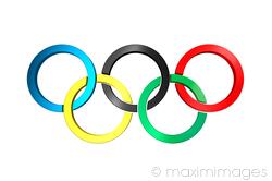 3D illustration of Olympic rings in their symbolic colors isolated on white background. MaximImages.com