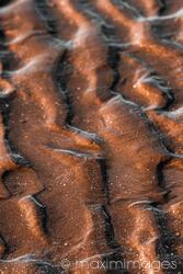 Closeup of a wave patterns in the sea sand at low tide in moody warm sunrise light in Co. Louth, Ireland. Abstract natural background texture design. MaximImages.com
