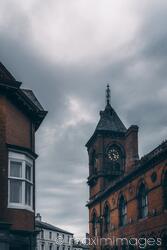 Clock tower in historic city scenery with dramatic sky in Newcastle, County Down, Northern Ireland. You can buy a license or prints of this high-resolution, high-quality photo suitable for large-size publications, large-format prints and posters.
