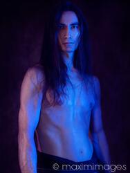 Royalty-Free photo of Sexy, shirtless, muscular Japanese samurai warrior with bare torso, long hair and a serious, stern look. Asian man with shiny sweaty skin on his half naked body. Artistic portrait in dramatic blue light with purple black background. Photo by Alex Maxim. This image is available for licensing for a variety of editorial and commercial uses in publications, designs, print and online.